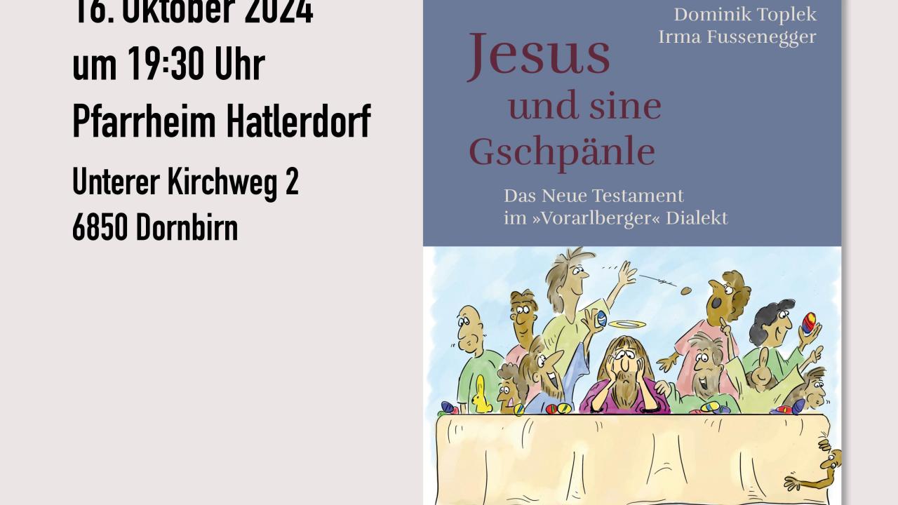 Bücherei Hatlerdorf - Lesung Jesus und sine Gspänle BUCHPRÄSENTATIONmit Dominik Toplek und Irma Fussenegger16. Oktober 2024um 19:30 UhrPfarrheim HatlerdorfUnterer Kirchweg 26850 DornbirnKooperation mit der Bücherei Hatlerdorf